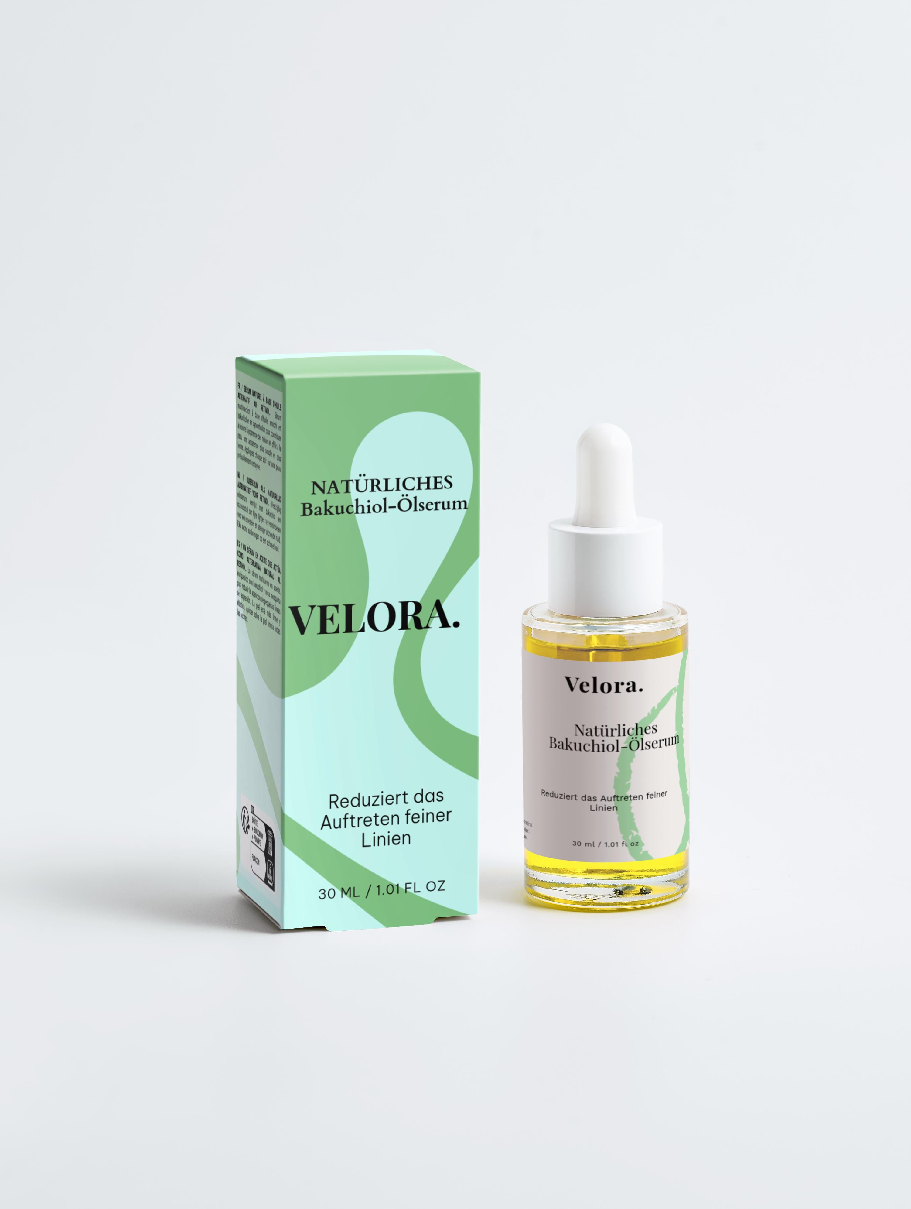 Velora vereint wirksame, natürliche Inhaltsstoffe wie Bakuchiol und Hagebutte in hochwertiger Qualität, um sanfte, sichtbare Ergebnisse zu liefern.